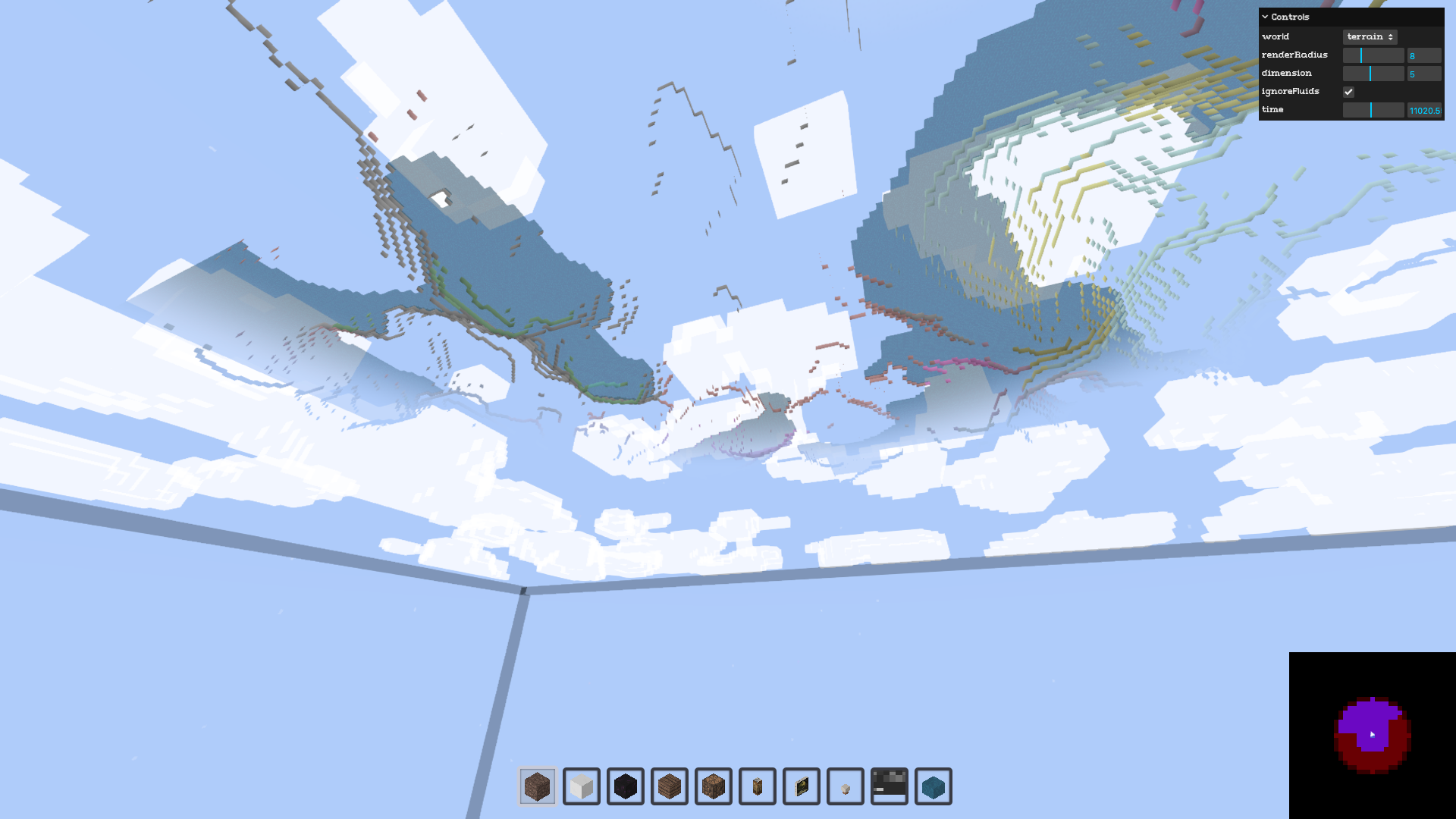 world.update requests chunks around the camera position. The second argument (camera direction) enables frustum culling - only loading chunks the camera is facing.
